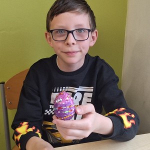 Dzieci z ogromnym zaangażowaniem tworzyły swoje prace, wykorzystując różnorodne materiały, faktury i techniki dekoracyjne. Każde jajko stało się niepowtarzalne – pełne barw, kreatywności i dziecięcej wyobraźni. Wspólna praca była nie tylko okazją do rozwijania zdolności manualnych, ale także do budowania radości ze współtworzenia i dzielenia się pomysłami.