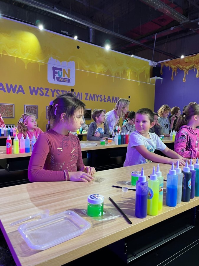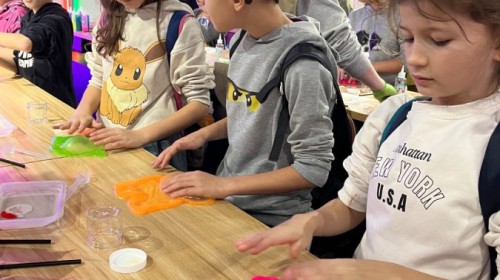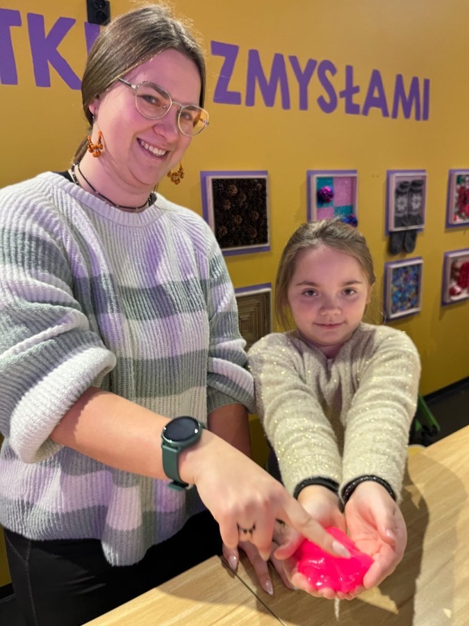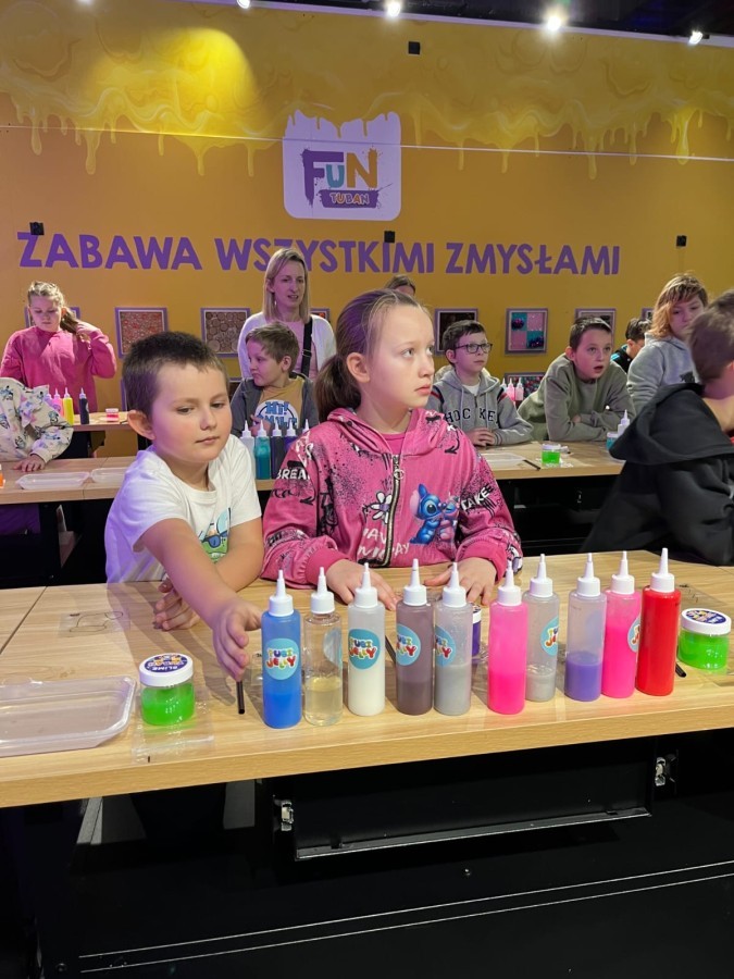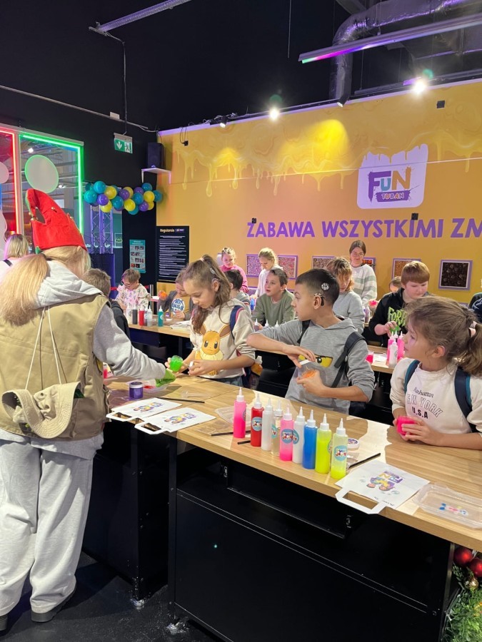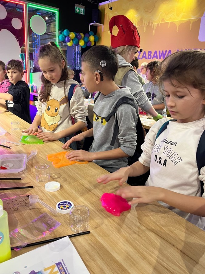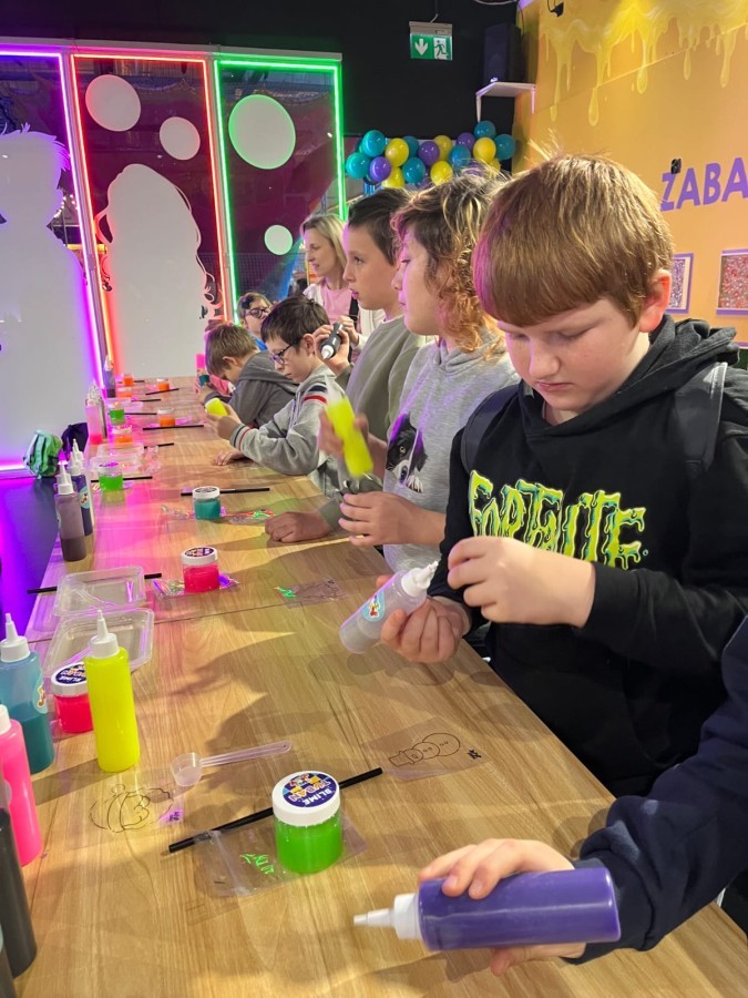 Kolejnym punktem programu był efektowny pokaz światła, który zachwycił uczestników grą kolorów, form i efektów wizualnych. Następnie odbyły się warsztaty robienia slime, podczas których każdy mógł własnoręcznie przygotować kolorową masę, rozwijając przy tym kreatywność i zdolności manualne.